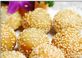 做法:將糯米粉150克用清水和成粉團,放人沸水中煮熟,然后加入350克生糯米粉、100克白糖揉成面團 作為為皮料。將紅糖、白糖加適量清水煮熬成糖膠液,再加入爆谷花、花生仁和芝麻仁拌勻成餡,并趁熱按成小團。然后取皮面 55克,包入餡料750克,搓成圓形,灑上一層水后,粘上一層芝麻,即成煎堆生坯。最后鍋內加植物油燒至六七成熱,放入生坯, 炸至膨起呈圓形至熟即可。