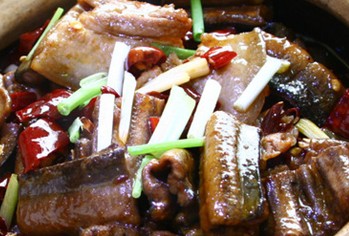 砂鍋鱔魚的做法:先將冬菇浸軟去腳、燒腩切塊,蒜肉用將滾之油炸黃撈起,把鱔魚洗凈抹水斬塊,加 腌料腌二十分鐘。然后將鱔魚沾滿生粉用滾油大火炸黃撈起,約二分鐘后重炸至金黃色撈起。再將生菜洗凈,切短段放在煲仔內 。[美食中國]在鍋內放油一湯匙,爆香姜、蒜,放冬菇和酒半湯匙,加入調味煮滾,把燒肉和鱔魚兜均勻,倒落在己放有生菜之 煲內,最后加蓋大火煮滾,放蔥和加油二湯匙即可。