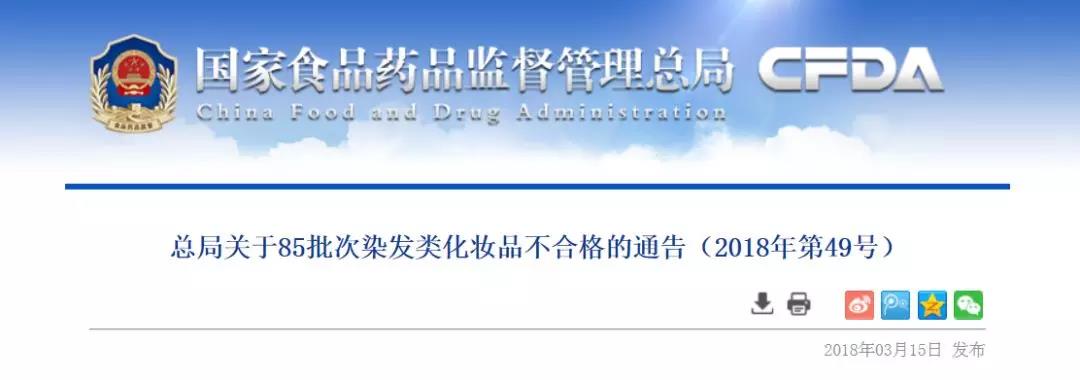 國(guó)家食品藥品監(jiān)督管理總局日前發(fā)布了《總局關(guān)于85批次染發(fā)類(lèi)化妝品不合格的通告》(2018年第49號(hào))。
