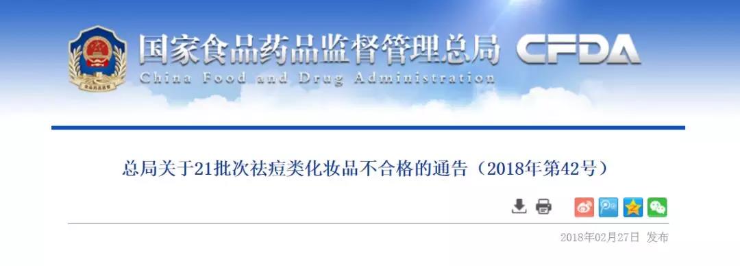 國(guó)家食品藥品監(jiān)督管理總局日前發(fā)布了《總局關(guān)于21批次祛痘類(lèi)化妝品不合格的通告》(2018年第42號(hào))。