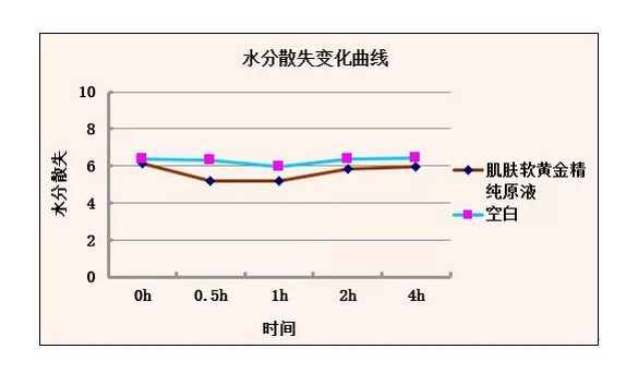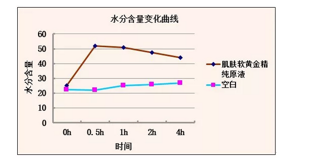 涂抹肌膚軟黃金精純?cè)汉?,皮膚水分含量開始增加,當(dāng)涂抹0.5小時(shí)后,皮膚水分含量達(dá)到最大狀態(tài)。隨后處于正常溫濕度環(huán)境下,皮膚表層水分開始散失。使用4小時(shí)后,精純?cè)和磕▍^(qū)域比空白區(qū)域還要高出20個(gè)百分點(diǎn),表明本款產(chǎn)品具有一定的補(bǔ)水功效。