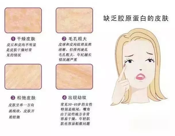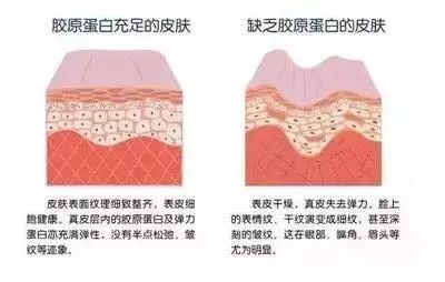 膠原蛋白是皮膚的主要成分之一,一個(gè)成年人約有3公斤的膠原蛋白,分布在全身各個(gè)組織器官中。皮膚除去水分后膠原蛋白的重量占了70%,為皮膚提供彈性和緊致度,并扮演著“深層水庫(kù)”的角色,為表皮提供水分。也就是說(shuō)肌膚干燥,缺水,松弛衰老是膠原蛋白不足的原因。