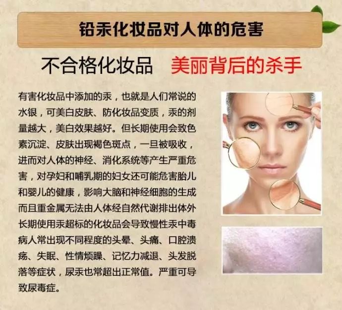 長(zhǎng)期使用含重金屬的化妝品可能產(chǎn)生色素沉淀,誘發(fā)過敏性皮炎、皮膚癌,甚至導(dǎo)致毀容。