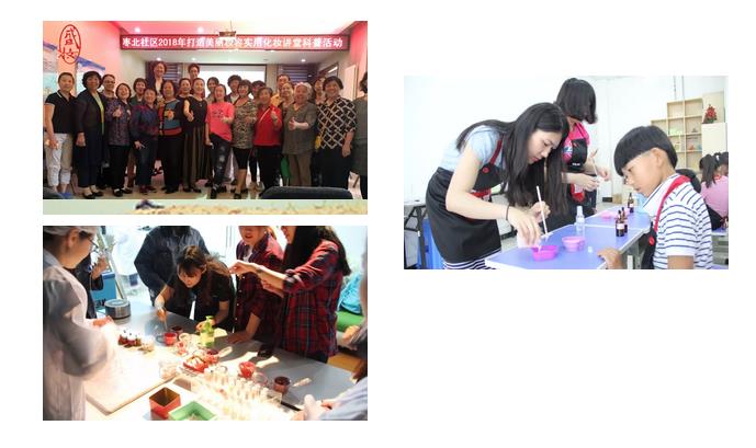 →養(yǎng)膚、護(hù)膚課堂進(jìn)社區(qū),為退休阿姨講解護(hù)膚知識,以及日常妝,舞臺妝等化妝技巧,豐富社區(qū)阿姨文化生活;
