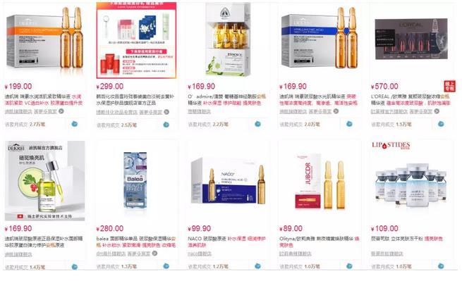 在某商城,搜索關(guān)鍵詞“安瓶”,銷量排名前十的產(chǎn)品,月成交均在1萬(wàn)余筆以上,其中排名首位的,月銷2.7萬(wàn)筆。