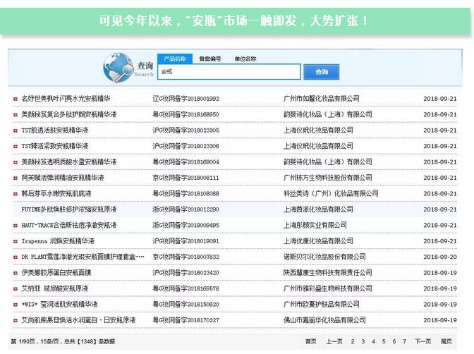截至2018年9月21日,產(chǎn)品名稱中含有關(guān)鍵詞“安瓶”的備案信息共計(jì)1348條。