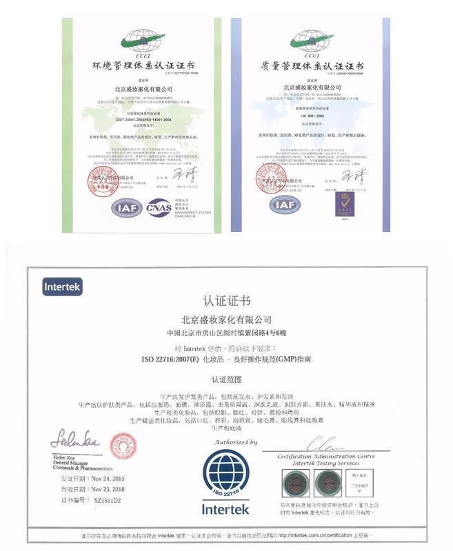 2018年5月,盛妝通過(guò)了華夏認(rèn)證中心依據(jù)轉(zhuǎn)版后體系的質(zhì)量管理體系和環(huán)境管理體系的覆蓋全條款的監(jiān)督審核,并通過(guò)了GMPC認(rèn)證,確保安全生產(chǎn),綠色生產(chǎn)。
